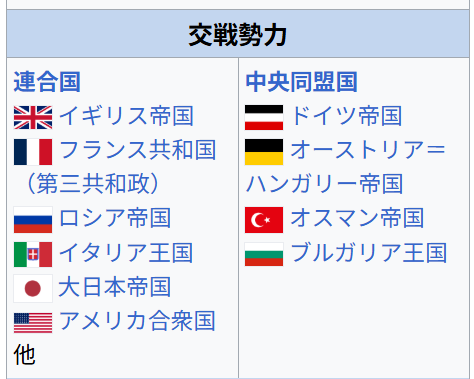 〈第一次世界大戦の交戦勢力:Wikimedia Commons〉