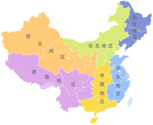 イメージがしやすいように、中国の地域別に分けた図を載せておきます。
