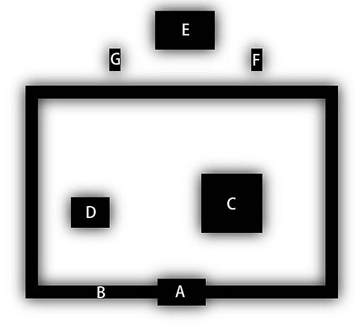 A:中門 B:回廊 C:金堂 D:五重塔 E:講堂 F:経蔵 G:鐘楼